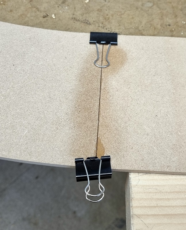 Because the height between the helix decks is at a premium any fixing that protrudes above or below the deck is not useful so the joints are created by gluing the steps together and holding in place with the clips. This superglue holds fast in about 10 minutes. The spray is a superglue actuator that causes it to set instantly. I used it on this first joint but as for the later connections, I found I didn’t need to. Simpy putting superglue on the step, fitting the next board, and clamping for 10 mins with the clips worked perfectly.