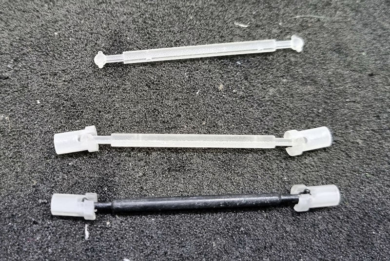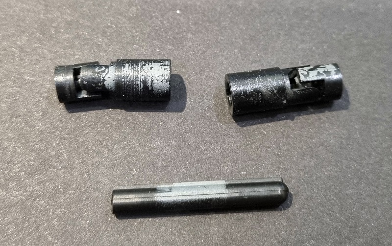 These big locomotives have two motors, just like the real thing. Each motor has a drive shaft that connects to the top of the truck and, through a set of gears, drives the wheels. But as the truck swivels the drive shaft has to adjust in direction and length. This is done by the use of universal joints and a sliding driveshaft. The ends of the universal joints are press-fitted onto the metal shafts of the motor and truck. And it’s at this point where they fail; the plastic cracks with age and no longer grips the metal shaft, preventing it from turning. Below is an original complete drive shaft with two universal joints and a sliding centre shaft.