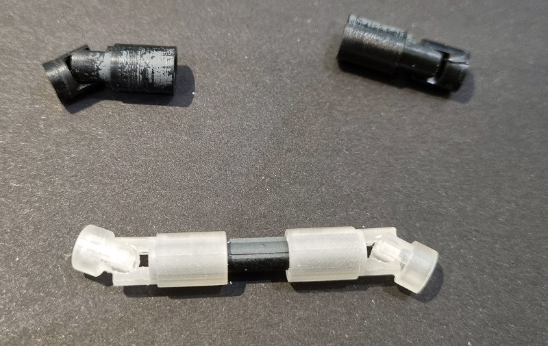 Using the original parts I was able to 3D model both ends of the universal, also taking into account the different metal shaft sizes. I needed to design the joint so it clips together and won’t easily pull apart, but is not such a tight fit that it cracks on assembly or prevents it from moving freely.