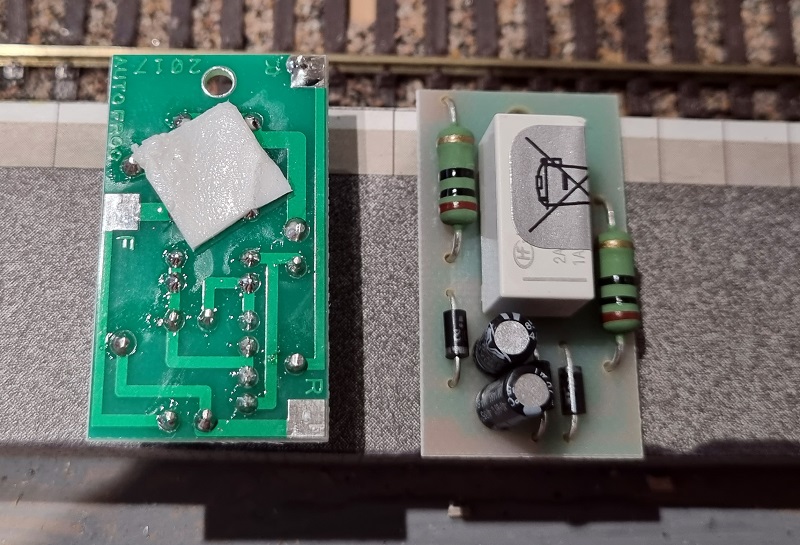 Although the frogs are now connected to a wire they will need to switch to the right power feed depending on which way a train is going. If it’s going from top left to bottom right the left frog will need to be connected to the bottom rail, but if travelling from the bottom left to top right it will be the top rail. This could be done with a manual switch but to make things easier I like to use Autofrogs. These are electronic relays or automatic frog polarity switches which detect if the frog is at the wrong supply and switch it before the DCC command station realizes there’s anything wrong.