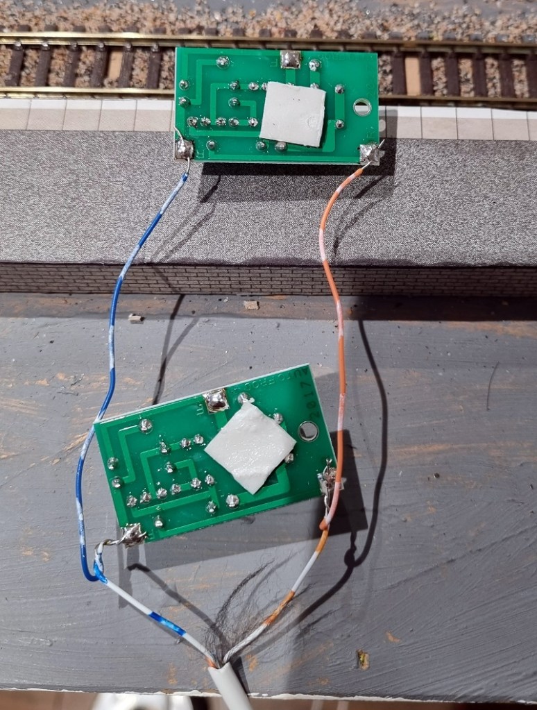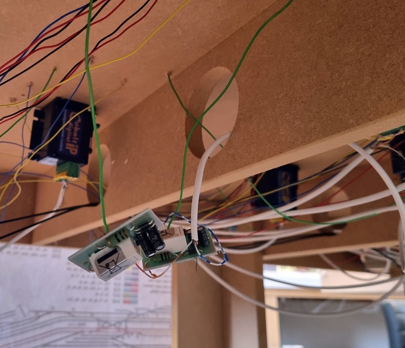 The frog wires are then connected to the Autofrogs under the layout and the four core cable is connected back to the main DCC bus.