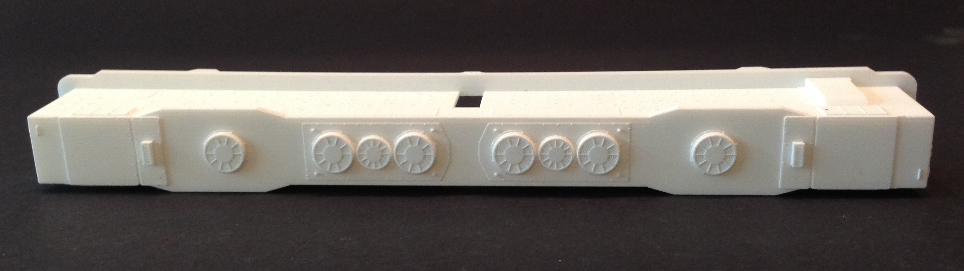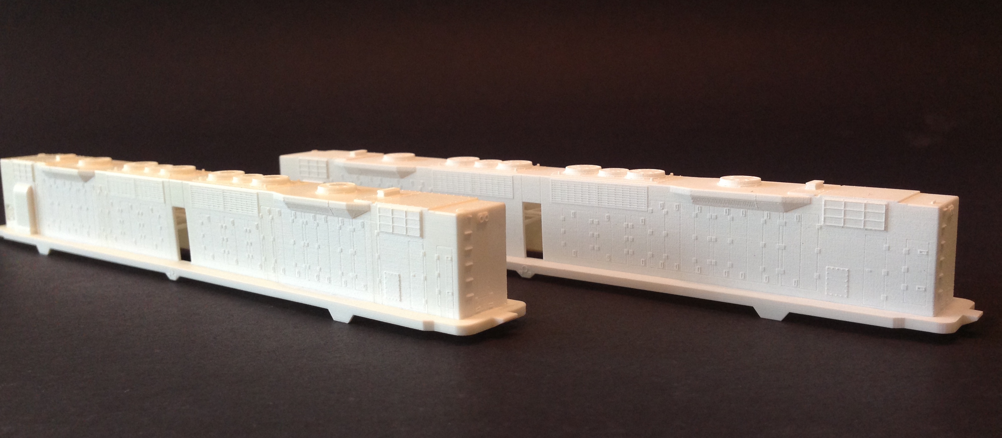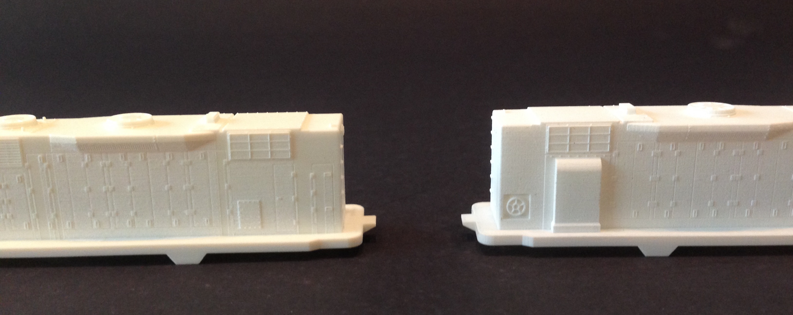 So the question is would one of these replace the need to get my models printed by Shapeways? The answer is not yet. The other issue is, as the technology for the desktop printers has improved, so has the technology for the commercial printers. You may recall from a few weeks ago I posted about Shapeways new material FXD (Frosted Extreme Detail), you can read the post here. I have now had parts and locomotive shells printed in this new material and I am very impressed. Below is a comparison between two N Scale EMD DD35 shells. The one on the left is printed in FUD (Frosted Ultra Detail) and the right in the new FXD, these pictires were all taken by Mike Musick. Normally I reduce the size of image files for my posts but I have left these as large images so if you click on them you can see the detail.