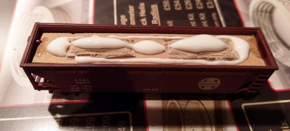 Next I use a white glue, simply placed in the car as below. Woodland Scenics’ Scenic Cement will work or any white glue but I like to use Tacky Glue, simply because it sets quickly and speeds up the operation.