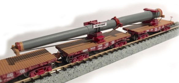 “The Naval Gun Load kit is based on the Mark VII Naval Gun designed in 1939 and first used aboard Iowa-Class Battleships during World War II. Measuring 16” in diameter, these guns could fire a 2,400 lbs projectile up to 24 miles. Each of these 68 foot guns weigh nearly 270,000 lbs and were shipped (breech first) across two(2) heavy weight flatcars with a third flatcar used as an idler. Many of these guns were manufactured by Bethlehem Steel in Pennsylvania and transported via the Pennsylvania Railroad across three(3) F22 flatcars. This kit comes complete with Frosted Ultra Detail (FUD) 3-D printed parts, full-color illustrated instructions, sixteen(16) inches of phosphor bronze rod and a ‘DO NOT HUMP’ placard sheet.