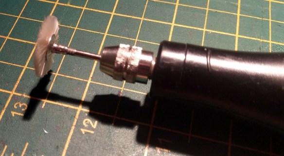 Since arriving from Shapeways all the parts above have simply been rinsed under warm water, soaked for twenty-four hours in Goo Gone, rinsed again in warm water, left to dry for forty-eight hours and finally run over lightly with a brush in a Dremel style tool as shown below.