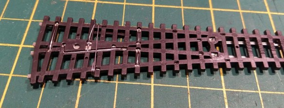Up close you can see the isolators. The wire, when unwrapped, is connected to the V section of the frog as well as the two check rails; this prevents any shorting from wide tread wheels which may touch both.