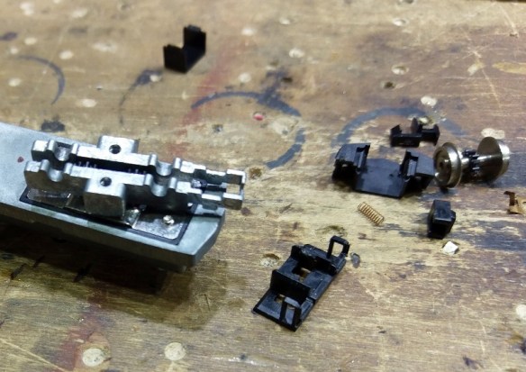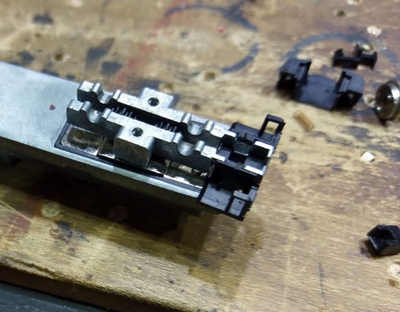 The rear pilot has a similar plastic molded section but this time it fits on the top of the truck sections. There is an extra clip which fits under the pilot to hold in the coupling and spring. In the picture below I have removed the clip.