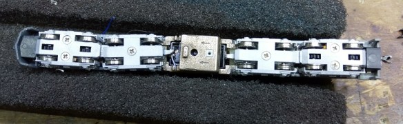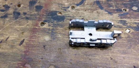 The front of the chassis is slightly easier than the rear as there’s less to reassemble. The truck center is as we left it with the black coupling pocket positioned between the metal halves, holding them in the right place.