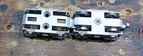 To reassemble I start with one of the inner trucks. These are not powered and simply track along behind, or in front, of the lead truck forming the span bolster. A ‘span bolster’ is the name given to this configuration of trucks. On the prototype they’re linked together by a beam which is connected to the locomotive at one rotation point, allowing the truck to articulate. Together, the trucks form one big truck under each end of the locomotive. Having the trucks individually fixed to the locomotive would make it harder to negotiate corners.
