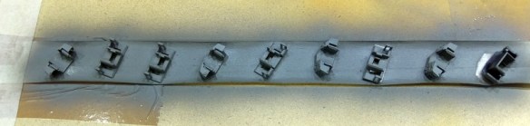 In last week’s post I stripped down the trucks and pilots ready for painting and below you can see all 12 trucks now in shiny silver. They’ve been sprayed with Humbrol enamel paint.