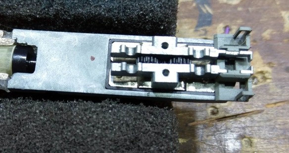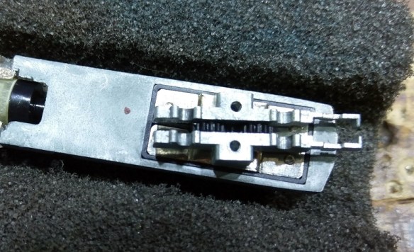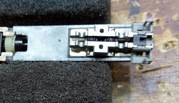 To stop the coupler falling out the U-shaped plastic clip fits over the pocket holding it all in place. The geared wheels can then be replaced. If, as below, your model had the brass wheels wipers, don’t forget to put them back in, ensuring the wipers are behind the wheels.