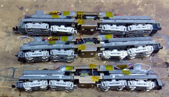 With all three chassis reassembled with their new silver trucks my attentions can now be turned to painting the shells, which is a time-consuming project and I’ll be covering that in another post soon, but just as teaser here’s one under way.