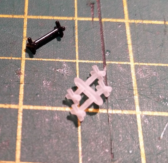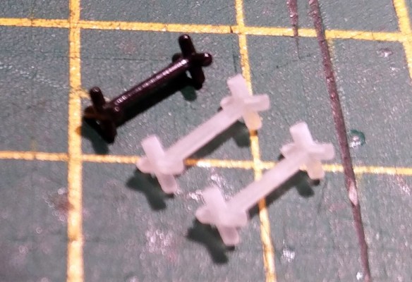 The drive shaft was then drawn up for 3D printing and designed for Shapeways Smooth Detail material (formally known as FUD). I use this for its accuracy and strength as it’s a hard acrylic plastic. As there are two drive shafts in each model I made a set joined together by a figure 8 loop to keep them together while in production. The loop is not actually connected to the drive shafts but the holes are not big enough for the crosses to pass through. The loops can simply be cut off.