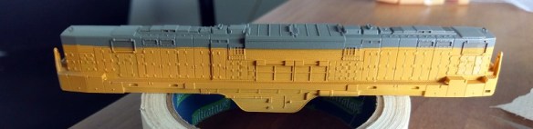 Once the primer is dry my attention is then turned to the main colors. Union Pacific locomotives have used the same colors for long time; Harbour Mist Gray and Armor Yellow. I intended to use True Color paints for these models and although the Harbour Mist Gray is spot on I find their Armor Yellow is a little too orange so I mixed my own to color match with several other Atlas and Kato UP models.