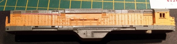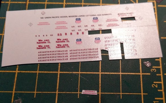 Once pressed down the clear film around the letters disappears. I then do the other decals such as the big Union Pacific, loco numbers and bottom red stripe. This stripe also runs around the sand boxes but it’s easier to do the main body before they are fitted.