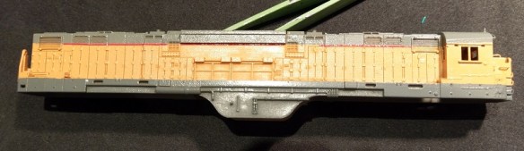 Once pressed down the clear film around the letters disappears. I then do the other decals such as the big Union Pacific, loco numbers and bottom red stripe. This stripe also runs around the sand boxes but it’s easier to do the main body before they are fitted.