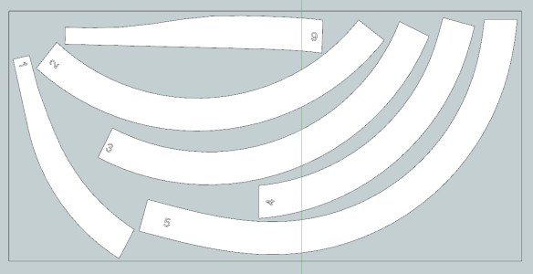 The lowest level, where the line enters the module would be flat solid timber. The track bed carrying the tracks up will be laser cut and supported on timber posts. This track bed is made from 6 sections, as shown below, allowing it to be cut from one piece of wood.