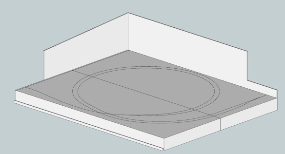 The idea is to create a corner module with the train entering from the left and exiting from the top. This should give optimum viewing for the loop. The result, as shown below, gives a rise of 2.5″ at a gradient 2.2%, on the inside track, which has a radius of 20″. The outer track, which has a bigger radius, has a gradient of 2.1%. This plan also creates a passing point which can hold a 13.5′ long train.