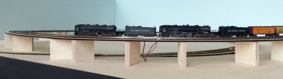 The other reason I wanted to do tests with these trains was for height. The double stack and auto-rack cars are some of the tallest on the modern railroad and I wanted to see how they looked in proportion to the loop. The real loop climbs some 77′ before it passes itself due to the considerably larger radius.