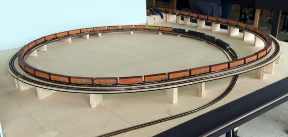 Of course several of our trains did have an issue with the gradient; combined with the drag factor of the curve some of the heavy freight cars in short trains with just one locomotive ended up wheel spinning and stalling. The answer is to add some more power and below is a video of how the Southern Pacific moved loaded coal trains over the loop. I think 15 locomotives will do it!