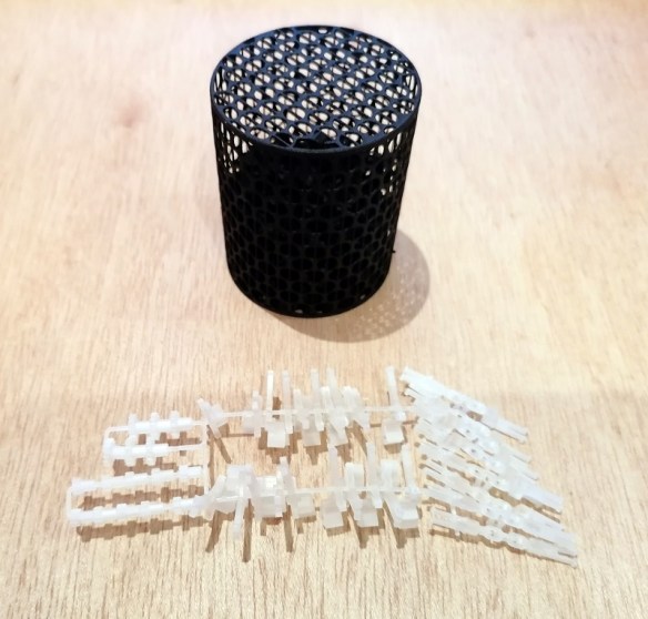 This is how I 3D print my N Gauge Short Rapido Replacements in Shapeways Black Versatile Plastic; you can read about those here. I added a few dummy Kadee couplings into the cylinder as well to see how they printed in this material.