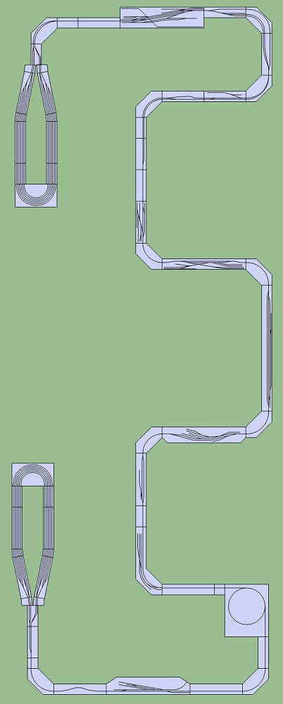 Not only is this the last passing place, capable of passing trains 17′ long, it also drops the mainline by 2 1/2″. Any train longer than 13′ will pass over, or under, itself as it traverses the loop.