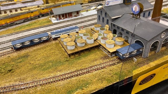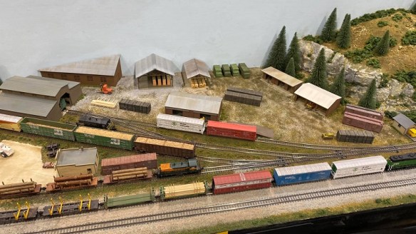 The mill pool is to the left of the module for washing the logs before they’re conveyed into the mill for cutting. Lumber products are loaded onto the freight cars and the sawdust is either burnt in the pyramid burner or loaded into high sided gondola cars for export.