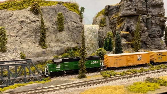 After ‘Dilithium Propellants’ comes ‘Cascade Falls’ which has some large rock formations worn down over centuries by the water tumbling over the falls. This module is also twin tracked and both lines cross the river on steel bridges. We always try to pass on the right as this Burlington Northern GP38-2 is doing. These modules were built by Marten and donated to the club when he moved away.