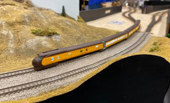 Leaving the East Yard the twin tracks enter the scenic boards and the first is ‘East Fork’ which is a two-into-one board. The M-10000 pictured below, often referred to as the Earth Worm, was built in 1935 for Union Pacific and was the first of their streamliners. It’s leaving the East Yard on its 5-mile run.