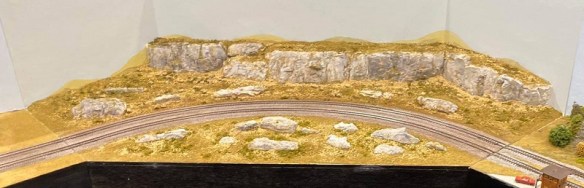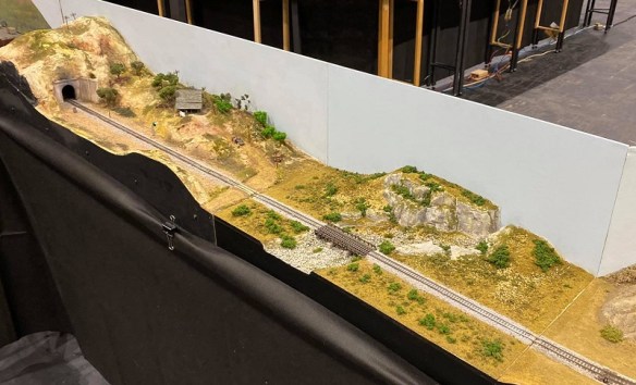 The line curves 90 degrees as it leaves the modules and enters the first of the incline or gradient modules ‘Pope Grade’ which was built by Kerry. The mainline passes through a large cut as it climbs uphill, from right to left, at 2.5%. The actual line raises 1 1/4″ over the 5′ module.
