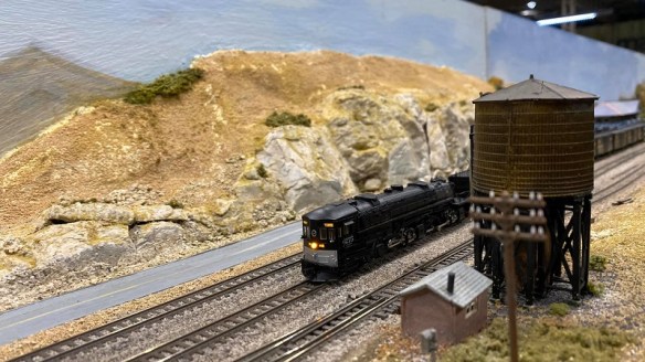 As this is the center of the layout there are frequent trains passing by and the SP overnight is headed by a massive AC12 Cab Forward, built between 1943 and 1944, and was the pinnacle of the SP steam power.