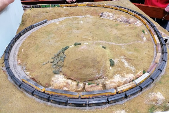 Leaving the loop, on the lower level, the mainline passes through ‘Plains’ built by Bob, which is another mileage board.