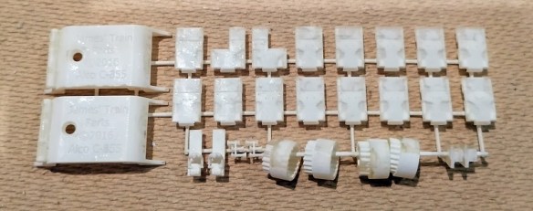 By grouping parts together I’ve also managed to bring the cost of models down and will be doing this with the new models. This group of parts for a pair of Alco C-855 locomotives has everything in it except the main shells, and they’re all attached in places where it won’t show on the model, as well as having the best surfaces facing up.