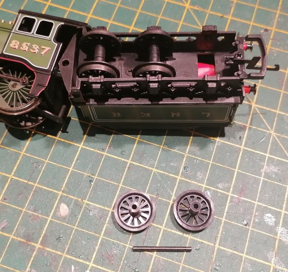 The first problem is to find metal wheels to use. The reason why it’s a problem is just about all the current metal wheels come with much shorter axles with pointed ends. But the old Mainline or Replica Railways (which is now Bachmann) locomotives had metal wheels in their tenders which were the exact same size on long axles. Of course, this does mean sacrificing another loco but six axles from two tenders is enough to do three Hornby locos as I’ve only replaced two wheelsets in each tender. An afterthought would be to see if the plastic wheels fit in the Mainline or Replica Railways tenders?