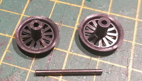 The axle for the wheels is simply a bar and the plastic wheels are in two parts. This design has been repeated on many locomotives of early design.