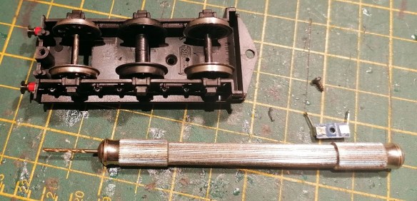 Then using a pin vice I drilled a hole, smaller than the screw, in the tender chassis using the hole in the pickup as a guide. The screw will cut into the soft plastic of the chassis.