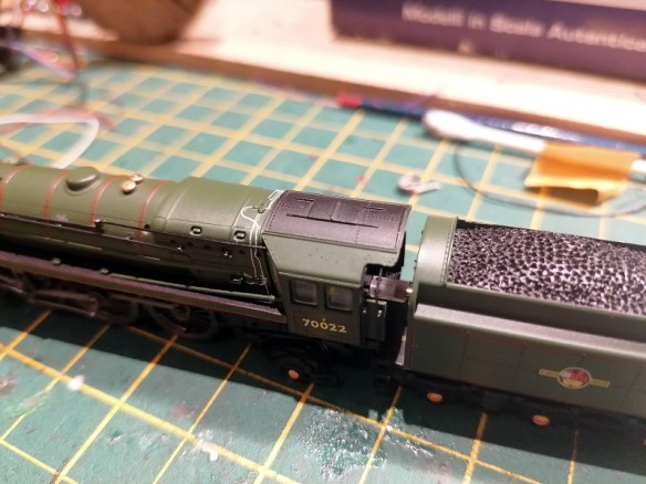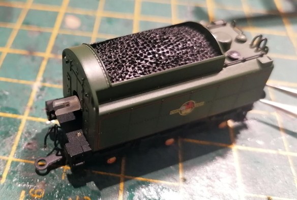 The motor, and DCC decoder, is packed into the tender and a drive shaft runs through the cab to power the main driving wheels. The motor axle has a yoke fitted to the end, as does the spindle in the cab. A driveshaft connects the two yokes and allows the tender and locomotive to twist without breaking the transmission of power, just like a drive shaft does on a car without being affected by the car’s suspension or steering.