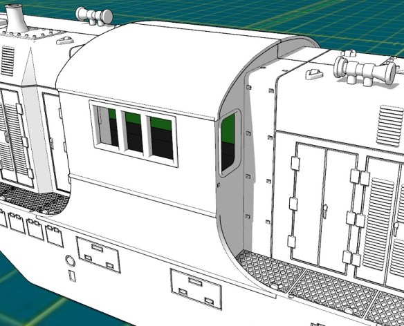 The last detail, for this week, is the windscreen wipers in the main windows. On the real locomotive these are very small but so are the windows. In order to model these in HO Scale, they will need to be etched in brass.