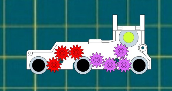 So, as an extra gear was unavoidable, I decided to make four extra gears, as shown below, and remove the blue gear completely. The four new purple gears are all the same as the red ones. To allow space for the new configuration of the red gears, the top of the truck center will also need to be extended, but that’s okay as there’s room between the truck center and the chassis.