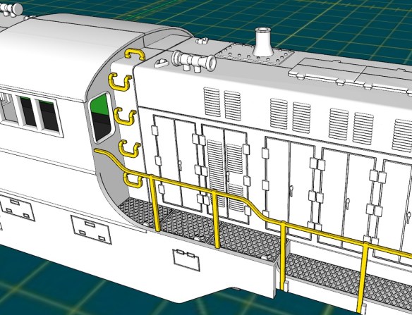 The body shell model, as shown below, now has all of its brass handrails positioned, along with their corresponding locating holes. Unlike the N Scale version, I will only be producing brass handrails for this locomotive because a 3D printed set, at the correct scale thickness, will simply be too weak and they’ll break very easily. The brass will be strong and when fixed into the mounting holes should stand up to the little knocks and bumps all of our trains accidentally get.