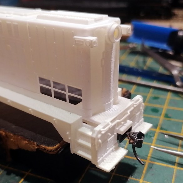 As you may remember the new 3D printed shell fits on top of a Bowser chassis taken from an Alco C-630, as shown below. The chassis is fairly standard and has two mounting holes at each end. The shell fitted perfectly over the chassis once I’d poked the wires up inside, with the exception of the lugs at each end. They were about 1/2 mm longer than expected, or rather the shell was 1/2 mm shorter than drawn. This can happen and is called ‘shrinkage’. When a 3D print, at least one printed in this material, comes out of the printer it’s heated to make all the support material liquefy and run off, then it’s left to cool. This is a very precise system and shrinkage can occur if the timing of the heating and cooling is not spot on. All the prints do it but the difference is normally negligible. But, given the size of the print, 1/2mm shrinkage over the whole length is very acceptable, and I’ve adjusted the 3D model to allow for this.