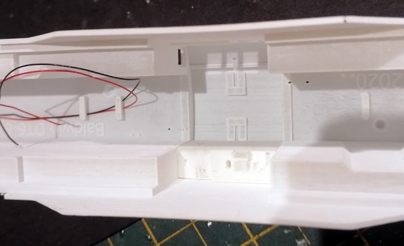 My cable loops also worked very well; using a pair of tweezers I was able to thread the wires through the loops which will keep them clear of the drive shafts. I also fitted an LED which will be for the headlight; I used a yellow one just so it shows up in the photo. The final one will be clear and emit a warm white light.