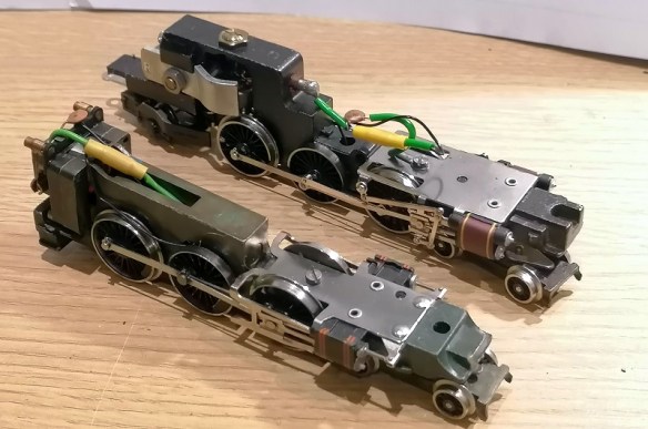 As well as being very different models visually they are different mechanically as well; the Duchess chassis at the back has a vertical motor and I covered the DCC installation procedure for this here. The Castle has the horizontal motor and that was covered here.