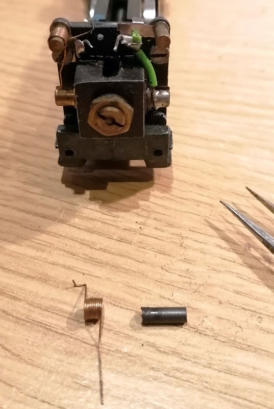 The Castle with the horizontal motor can suffer from the same thing although it’s not so common. Both motor brush holders are at the back on either side of the motor. Again I’ve cut the existing wires off but left the heavy gauge wire on the right, which runs from the connecting point to the brass sleeve on the right. This is because it’s a better connection than relying on the spring to deliver the power. The right-hand sleeve has the isolating material.