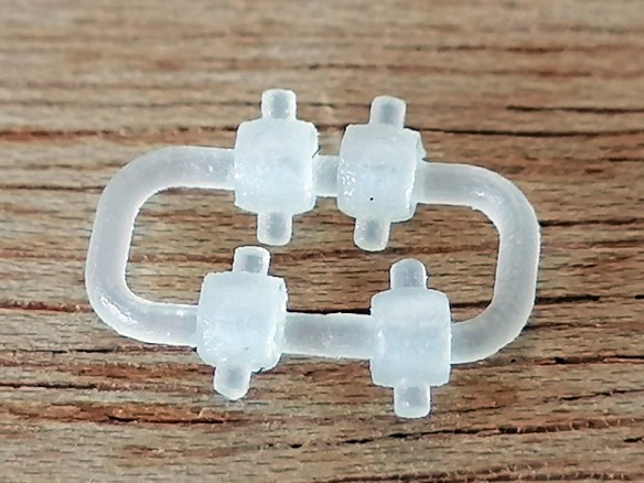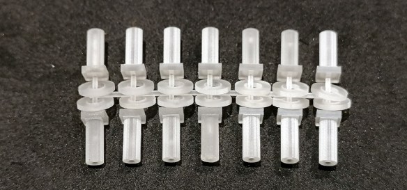 I printed them in Shapeways Smooth Fine Detail Plastic as this material is very accurate and cost-effective. They were printed on a sprue, and as they are transparent, you can see the circles on the far side where the sprue was cut off.