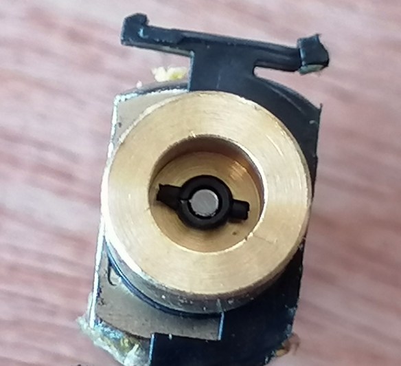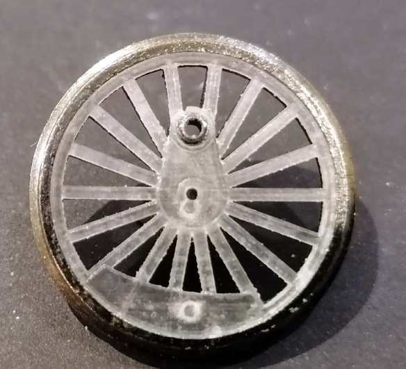 Initially, I was very happy with them, although they still need to be cleaned ready for painting, they looked perfectly round, and all the detail, such as the raised counterweight edge and rounded spokes, have come out well. But I’d made a mistake; the offset hole which fits over the connecting rod fixing peg didn’t fit. Looking at the wheel below you can see this fixing peg has two diameters. The wheel center fits over the larger section and I measured the smaller.