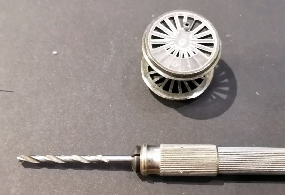 But I still needed to see if the wheel center fitted in the actual wheel, so I used a drill in a pin vice to open out the hole.
