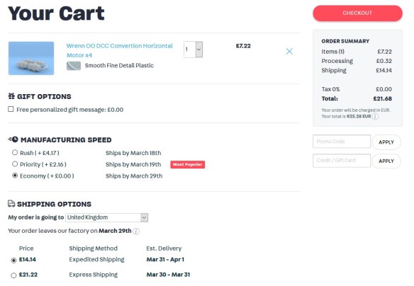 Ordering any of my 3D printed parts has always been easy through Shapeways and their checkout page looks something like this.
