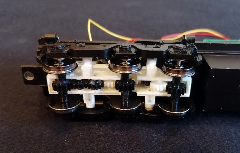 The bogie for this locomotive only has power to the center wheels via the plastic tower gears. The metal worm gear sits in brass bearings on top of the bogie tower.