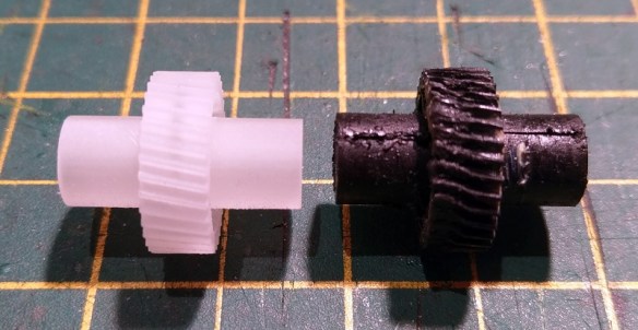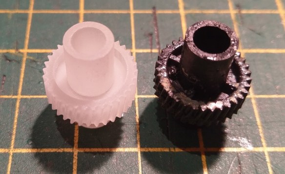 To solve the problem I have designed a 3D printed gear and axle set to be a direct replacement. These have been 3D printed in Shapeways Fine Detail Plastic because of the material’s accuracy and toughness.